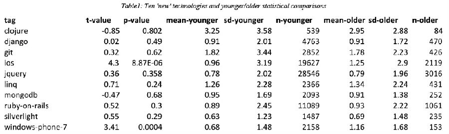 论文的作者分析了Tag,用了最近5年内比较流行的技术Tag,然后用了一套比较严谨的算法来查看那些所谓的“老程序员”是否在新技术上跟上不了,所谓跟不上,也就是这些老的程序员在回答这些新技术上并不活跃。所谓老,就是37岁以上的程序员(就是我现在的年纪)。
