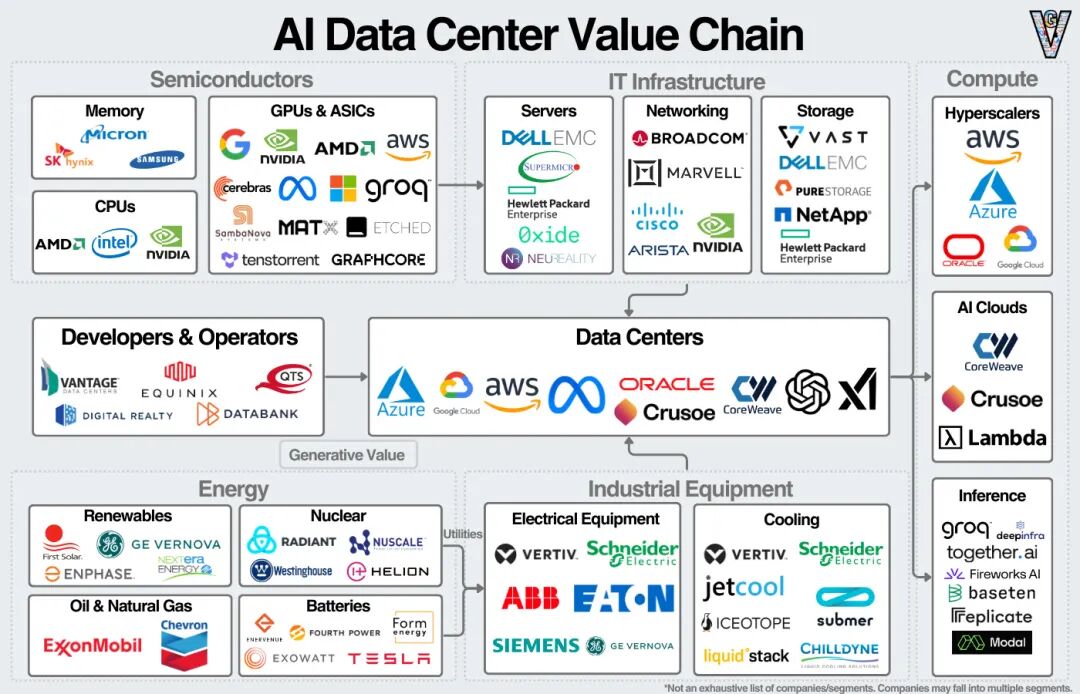 相比之下,微软、Google和亚马逊显得“稳健”,但微软近期也加速布局,落成了“全球最大之一的AI数据中心”。王辰晟分析,云厂商因已有超10吉瓦的现有数据中心,基数不同导致增长策略差异。但所有玩家都在供应链上疯狂卡位——从GPU、存储器到变压器,无人敢松懈。